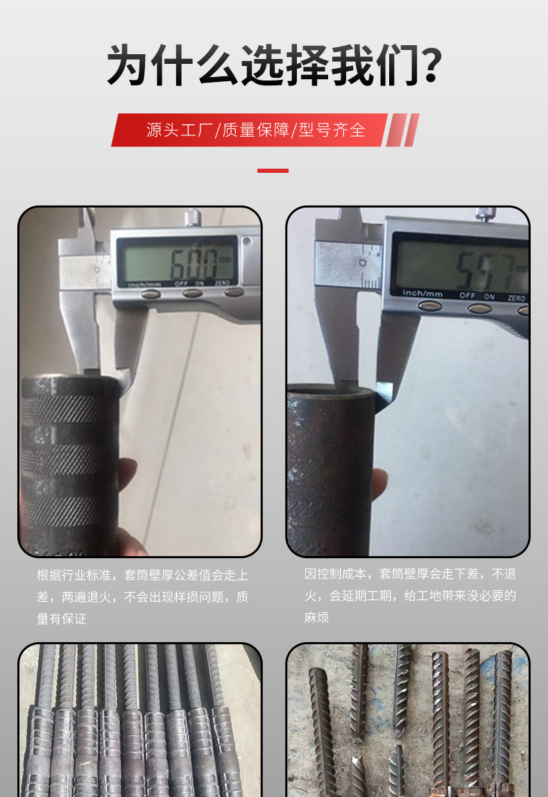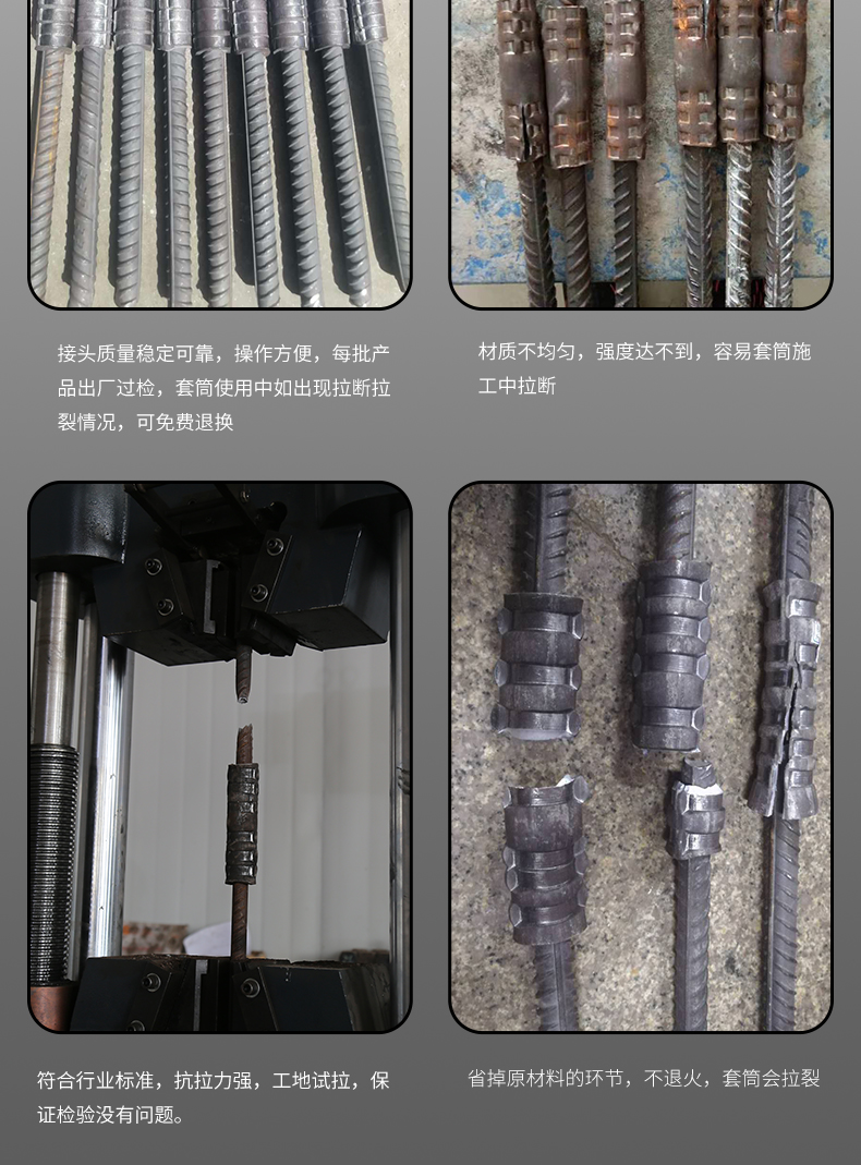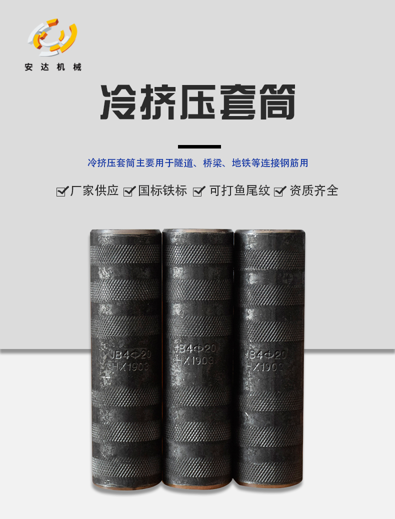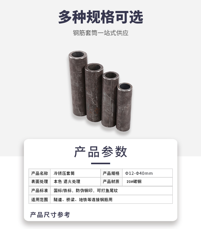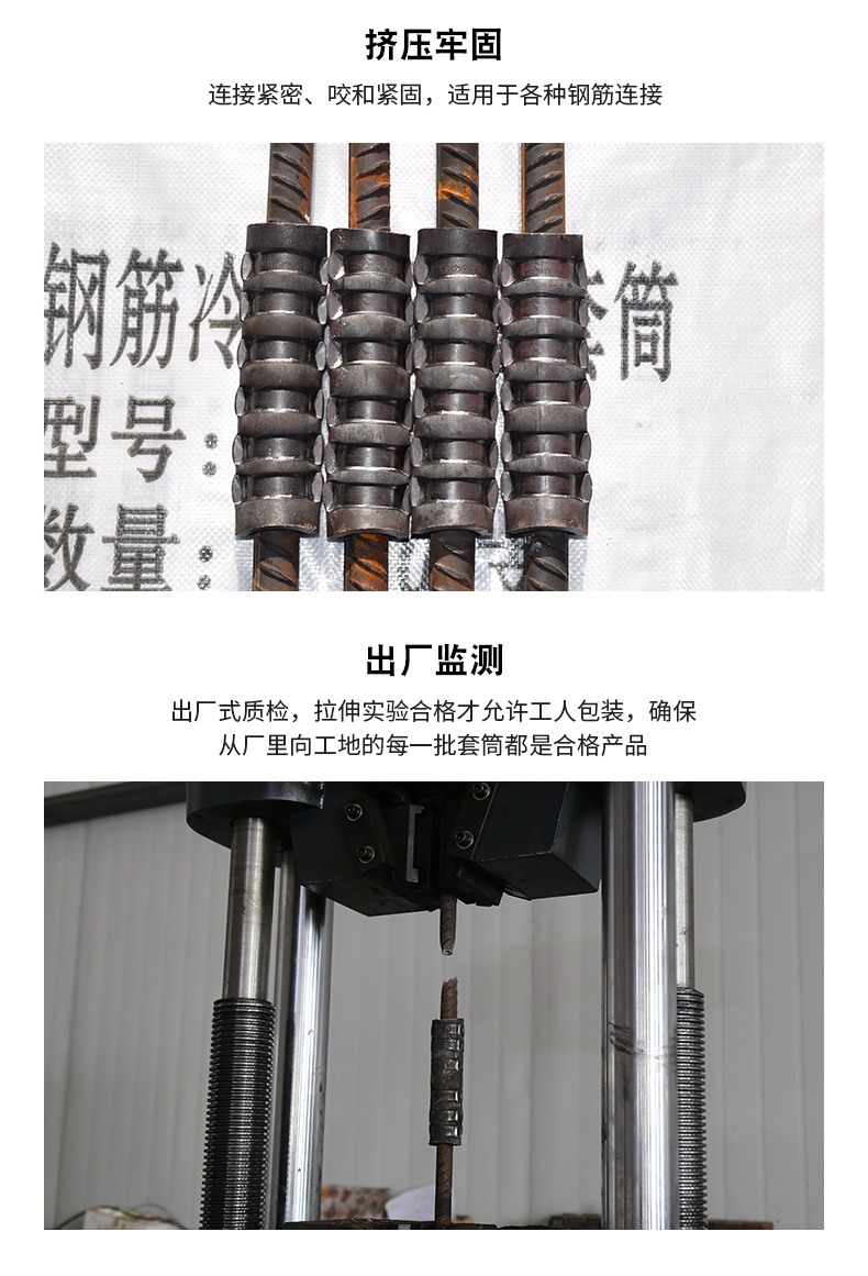 冷挤压套管和钢筋的规格应当相同,并且不能用大的规格取而代之。当钢筋的直径时有发生变化时,如果钢筋相距一级,则可以采用大直径的套管。如果两个级别的钢筋不同,则应增加过渡段,例如,如果某些列的钢筋从φ32变为φ4,则将套管与φ4变为φ4->φ36钢筋连接,然后再连接φ36套管用以连接φ36->φ32钢筋。