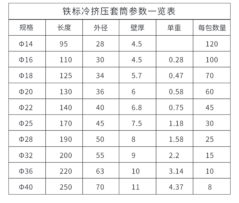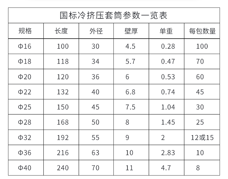 产品详情:冷挤压套筒使用定制的材质,生产工艺和公司装置,加工速度快,精度高,批量生产,严苛按照标准化对产品质量,生产工艺和程序展开检查。同时,按照分组规范对原料和制品开展分批抽样检查。加工精度大于规定的基准值。