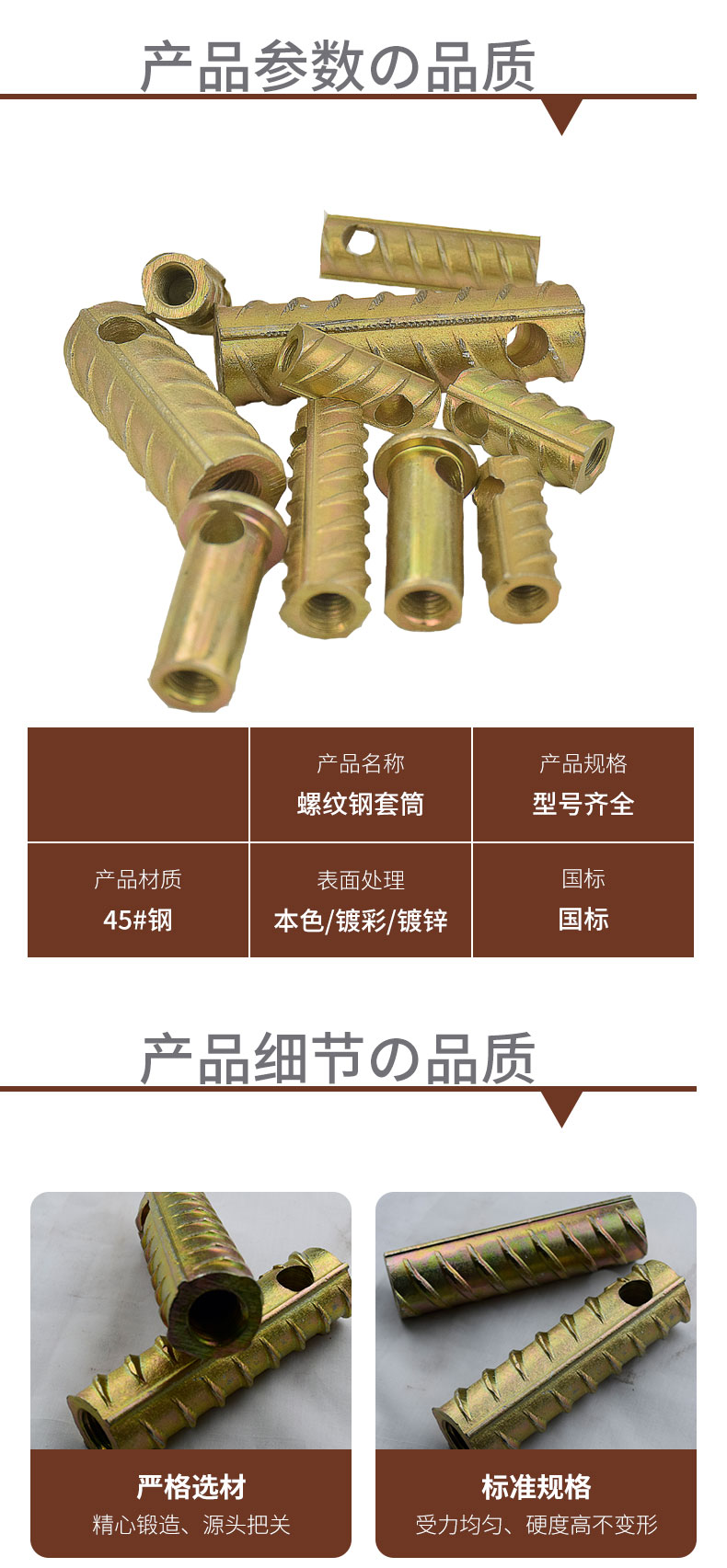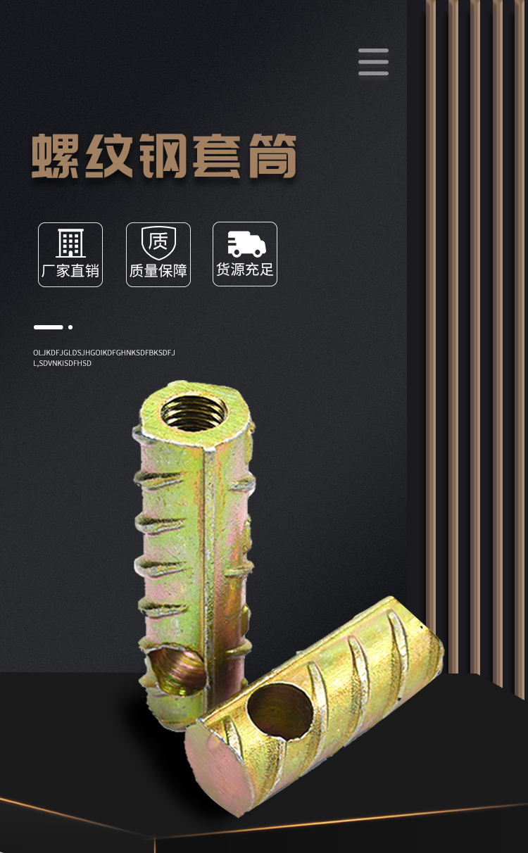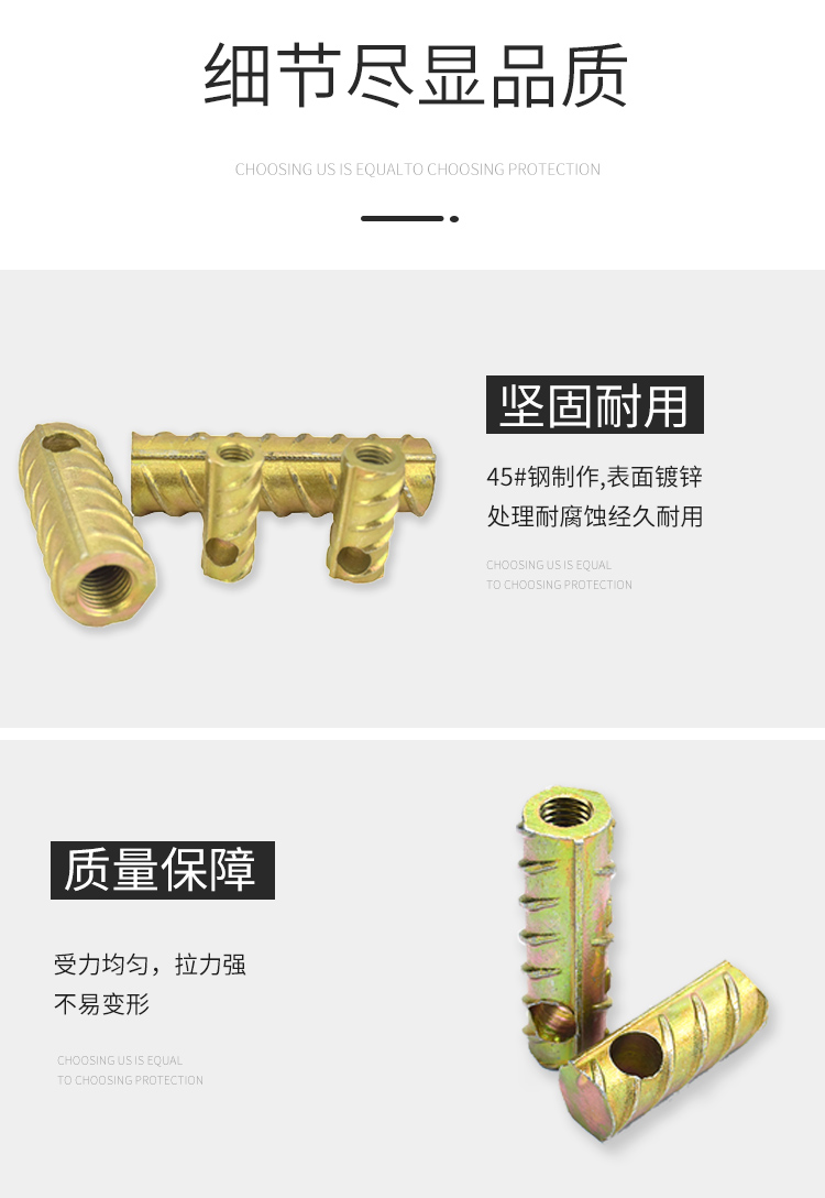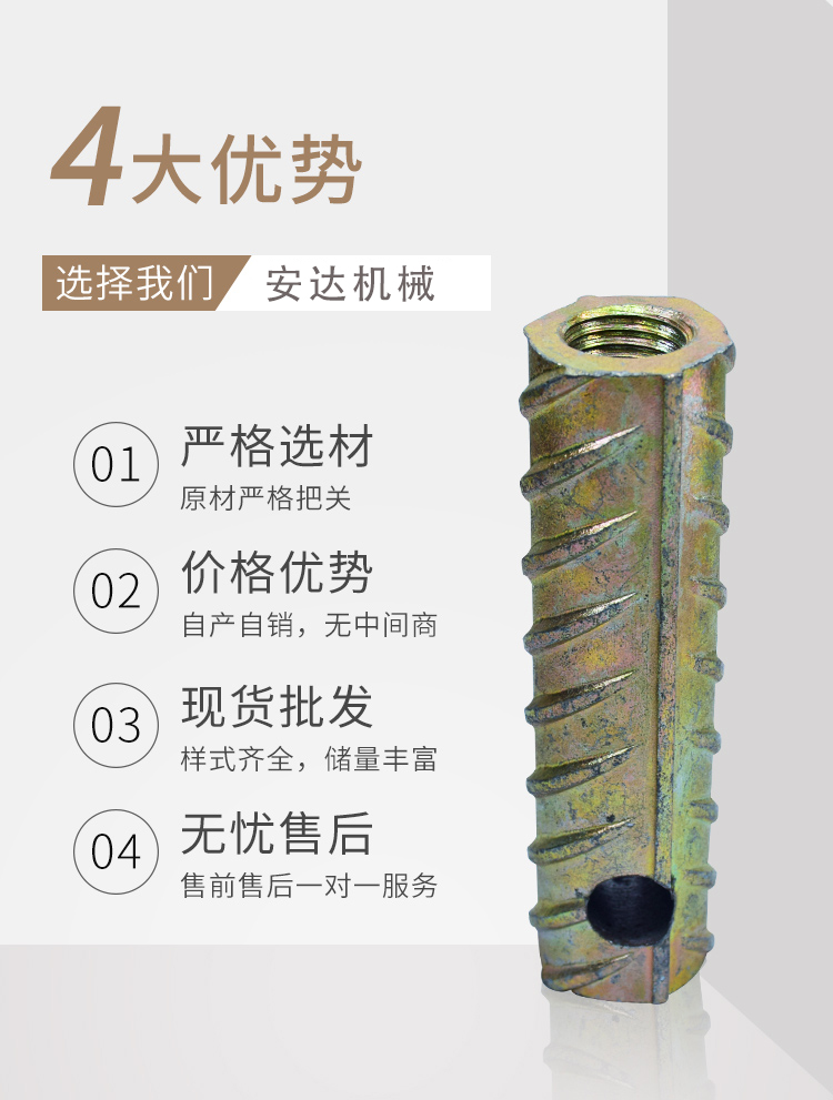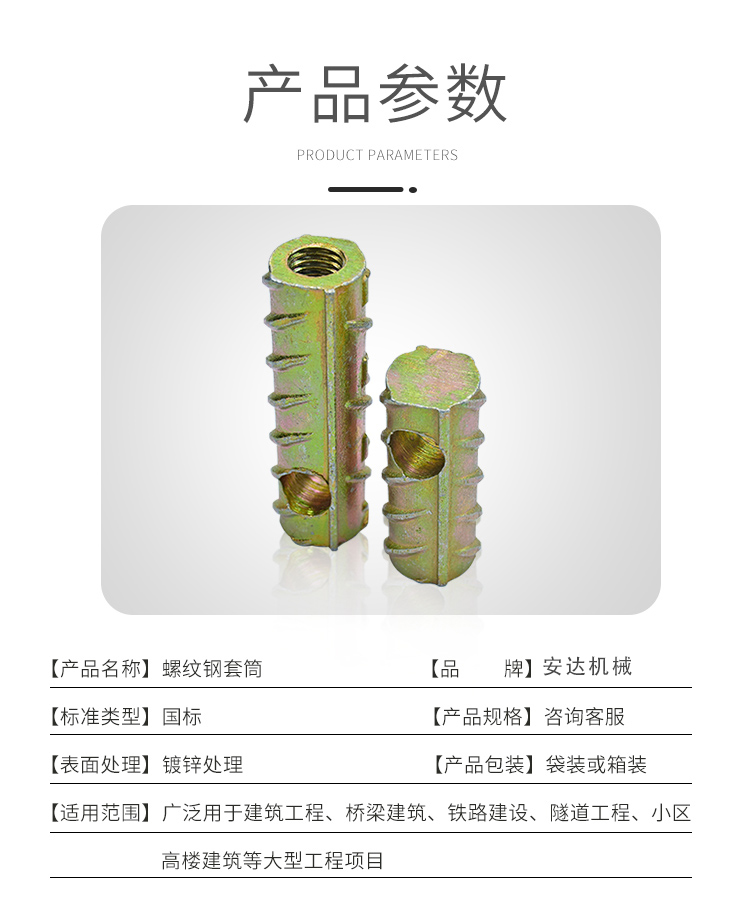 1.右侧钢筋套筒号为钢筋。碳钢构造为45,设计合理,连接质量精确,空间大。2。在螺纹钢套生产线中,钢筋的基本参数是根据HRB5杆的强度设计的,请勿将HRB335,HRB4,HRB5与剑匹配,放入剑杆。