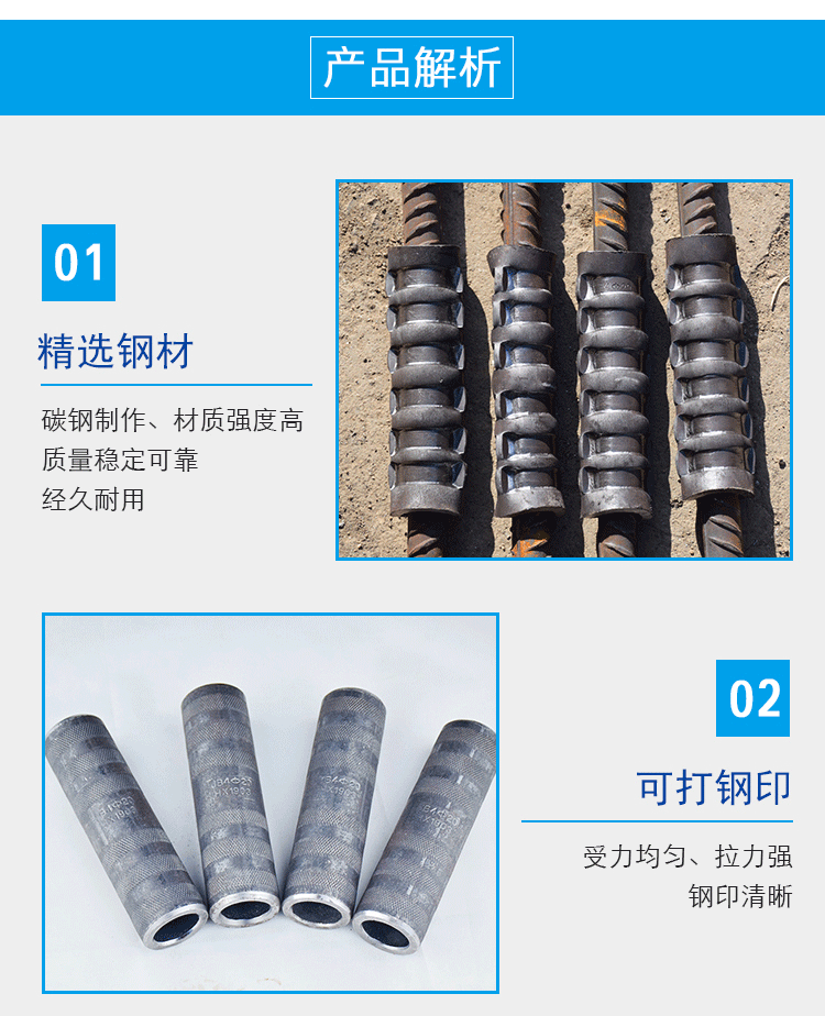 2.连接钢套:须要具足够的强度和不错的可塑性,其强度应大于连接的钢筋的强度。所用的连接套筒材料为优质碳素镇静钢,其性能指标为:(1)机器性能:屈服强度,抗拉强度,伸长率,硬度。